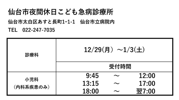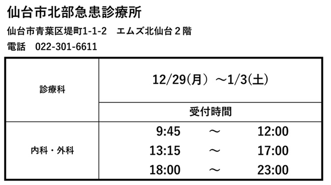 年末年始期間中の、仙台市急患センター、仙台市北部急患診療所、