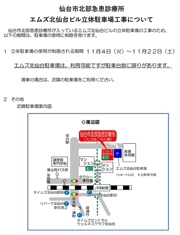 エムズ北仙台ビル東側「エムズ北仙台駐車場(診療所指定駐車場)」をご利用ください。立体駐車場のため大型車台数制限あります。 |