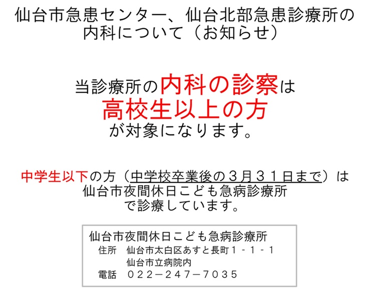 仙台市夜間休日こども急病診療所 電話 022-247-7035 |